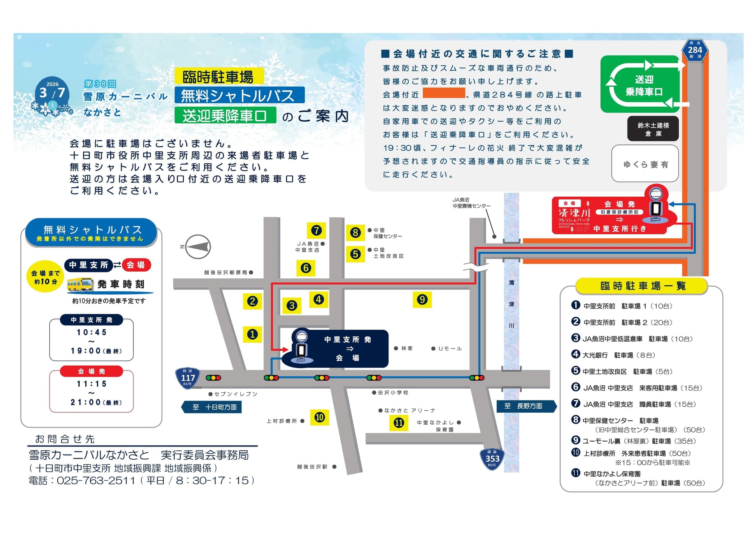 A1: 会場に駐車場は設けておりませんので、十日町市役所中里支所付近の臨時駐車場に駐車して